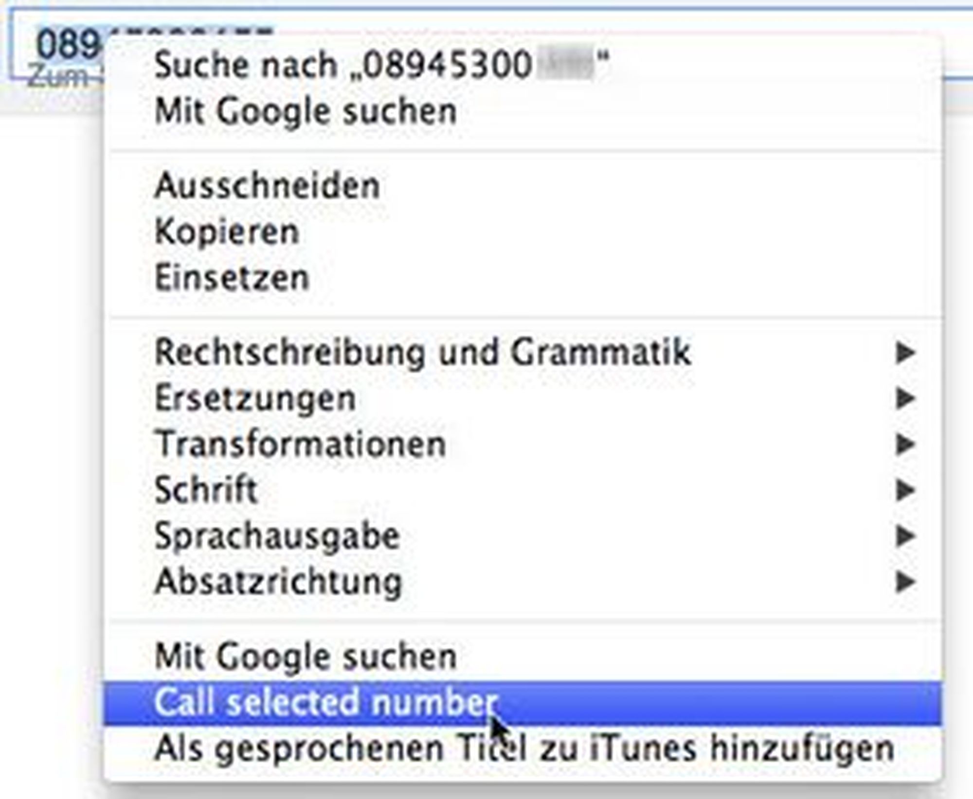 Wenn Sie eine Telefonnummer per Hotkey-Dial anwählen, markieren Sie die gewünschte Telefonnummer (z.B. in Ihrem Browser oder aus der OS X Kontakte-Anwendung) und drücken Sie Shift + cmd + *-Taste in Kombination.