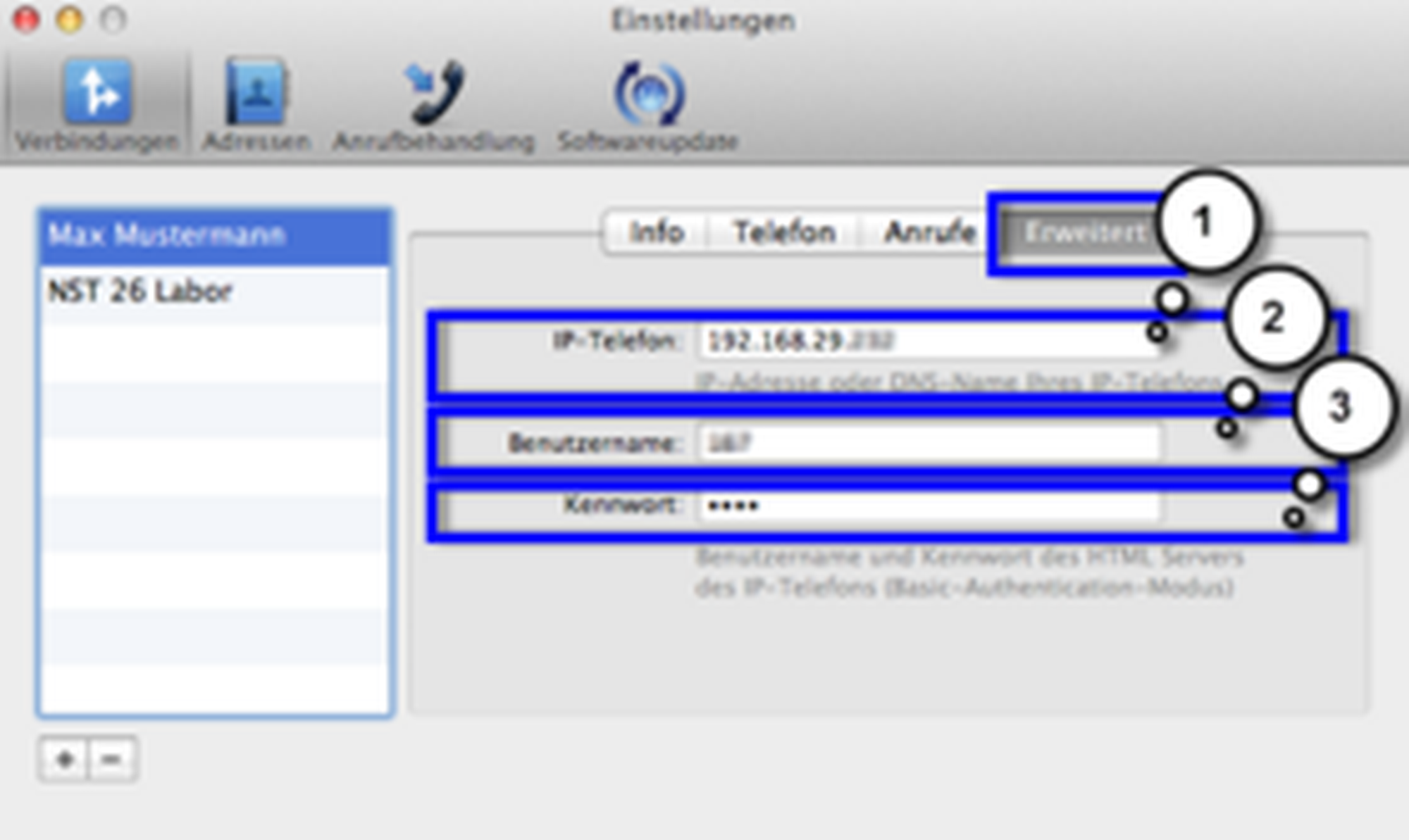 Geben Sie unter dem Reiter "Anrufe" folgende Werte ein: