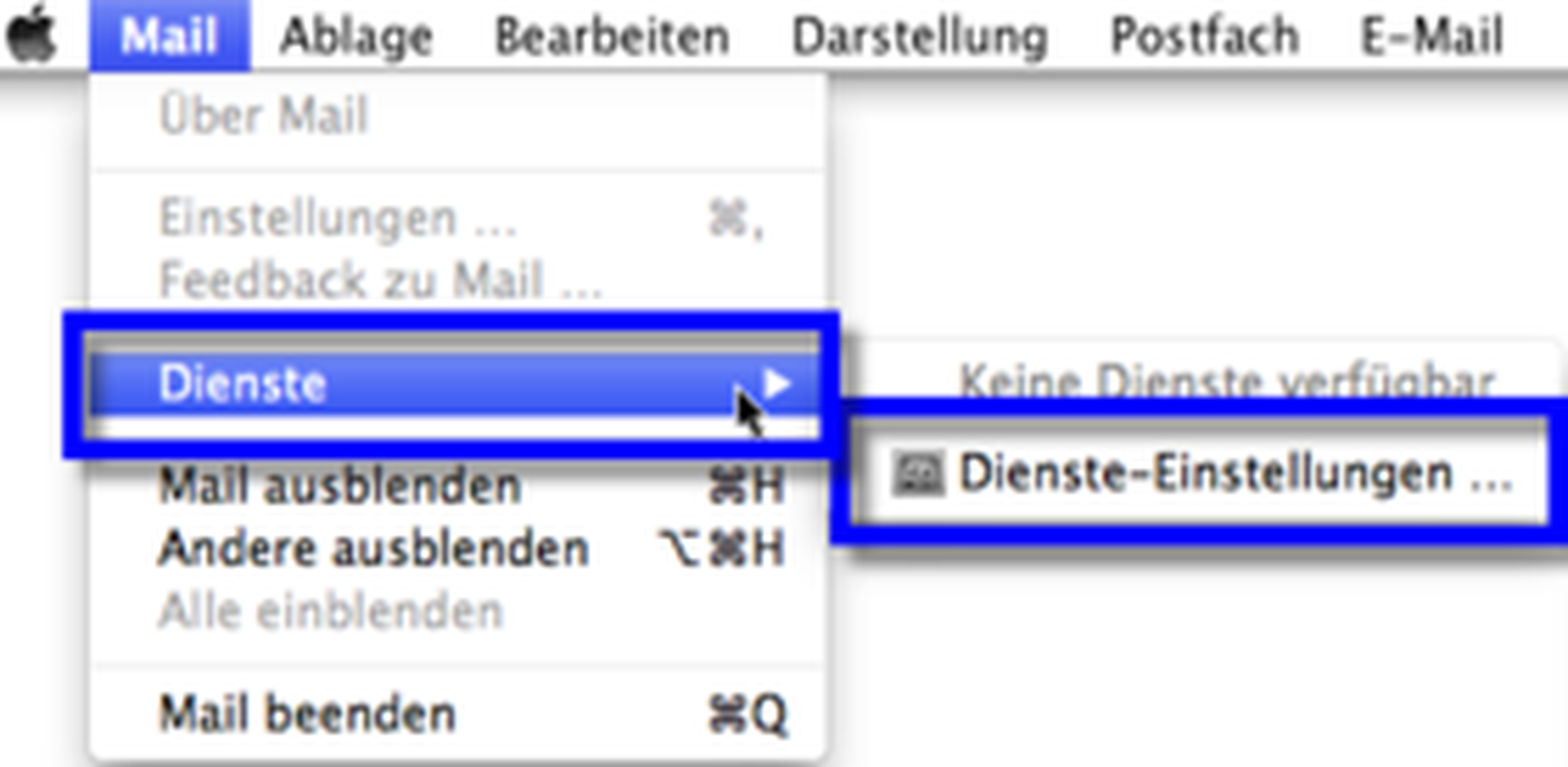 Klicken Sie dazu in einer beliebigen Anwendung (in diesem Beispiel aus der Anwendung "Mail") auf Dienste und anschließend auf Dienste-Einstellungen... .