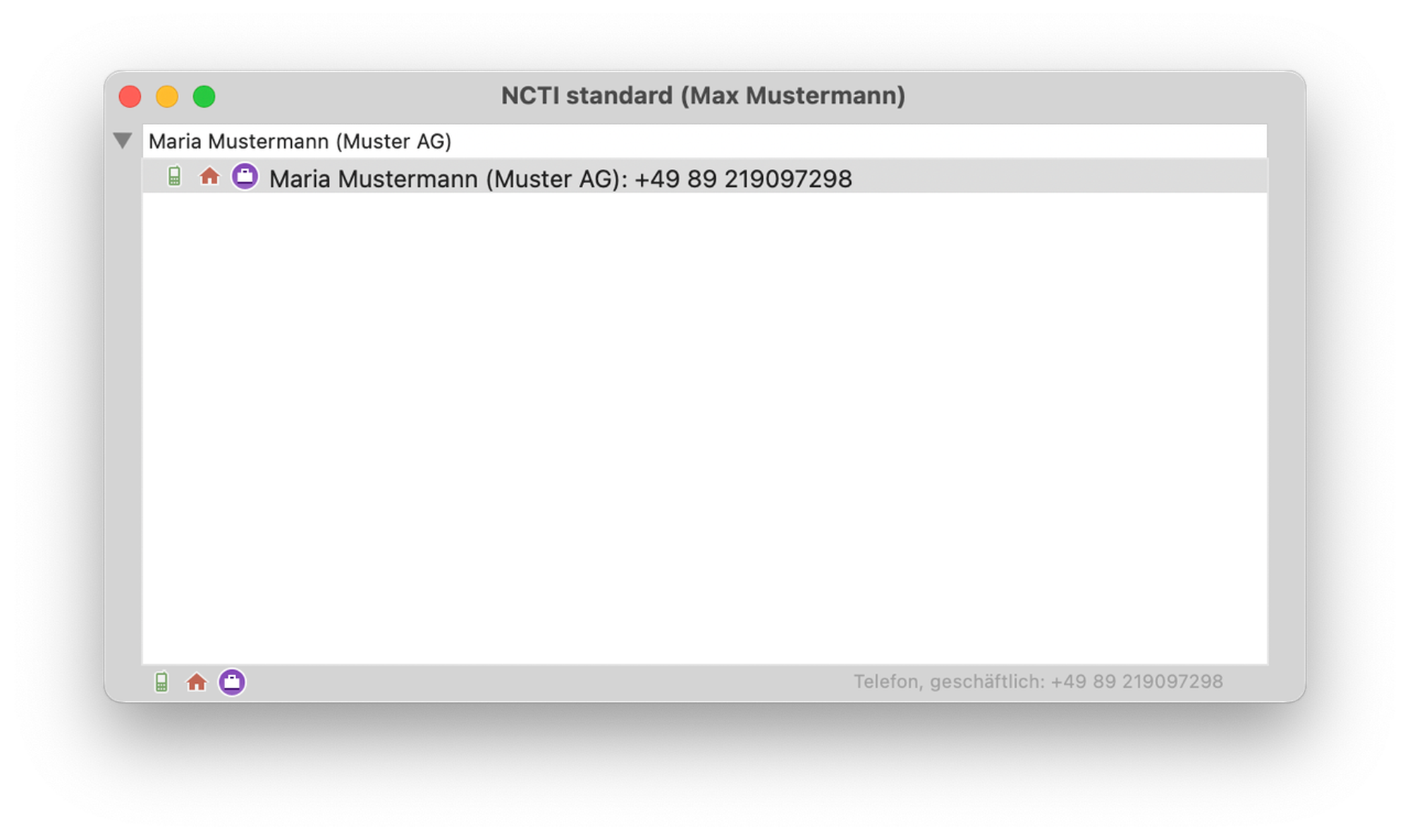 Um nun einen Anruf aus Ihrem Adressbuch tätigen zu können, wählen Sie einen Kontakt aus Ihrem Adressbuch und klicken Sie die anzurufende Nummer mittels der Ihnen verfügbaren Icons an. Diese sind abhängig von den hinterlegten Rufnummern Ihrer Kontakte aus dem Mac OS Adressbuch.