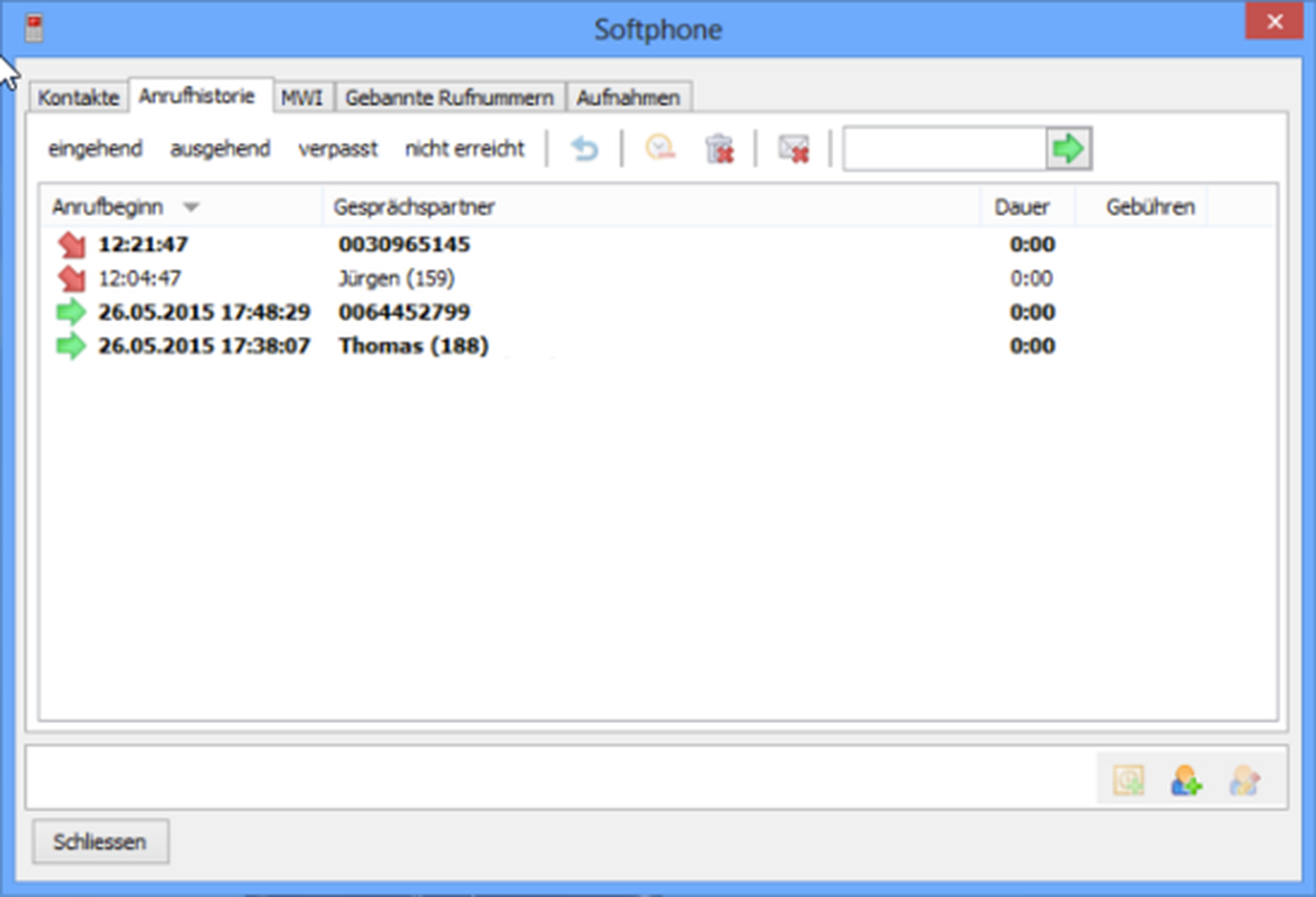 Sie haben die Möglichkeit, Ihre Anrufhistorie mit dem Button "Telefonbuch/Historie öffnen" zu öffnen. Daraufhin erscheint eine Liste aller ein- und ausgehender Anrufe.