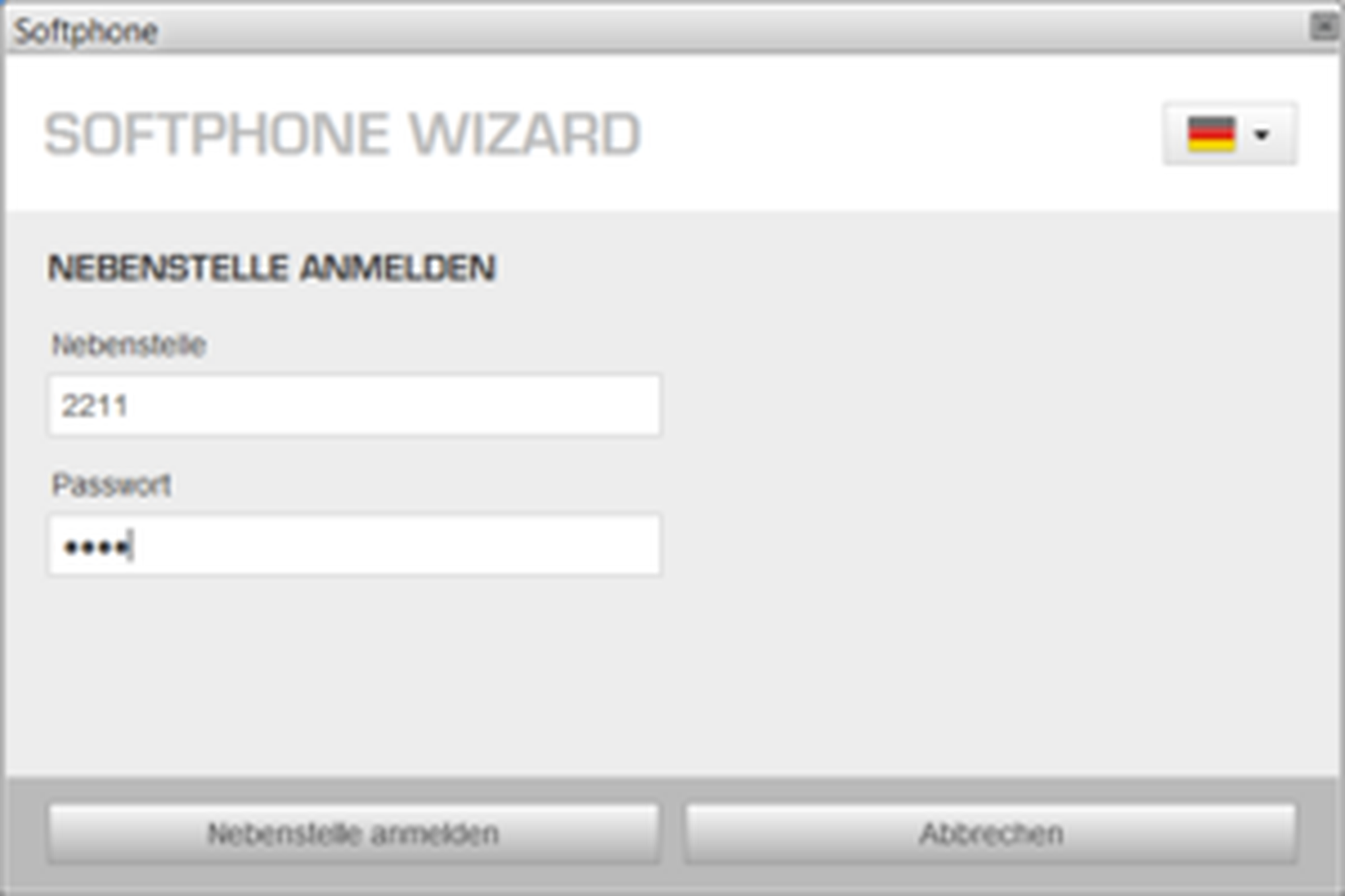 Nach dem Einloggen mit Kundennummer und Passwort startet nun das SoftphoneBASIC. Es ist allerdings noch keine Nebenstelle zugewiesen. Mit Klick auf das gelbe Pfeil-Symbol erscheint nun das folgende Fenster: