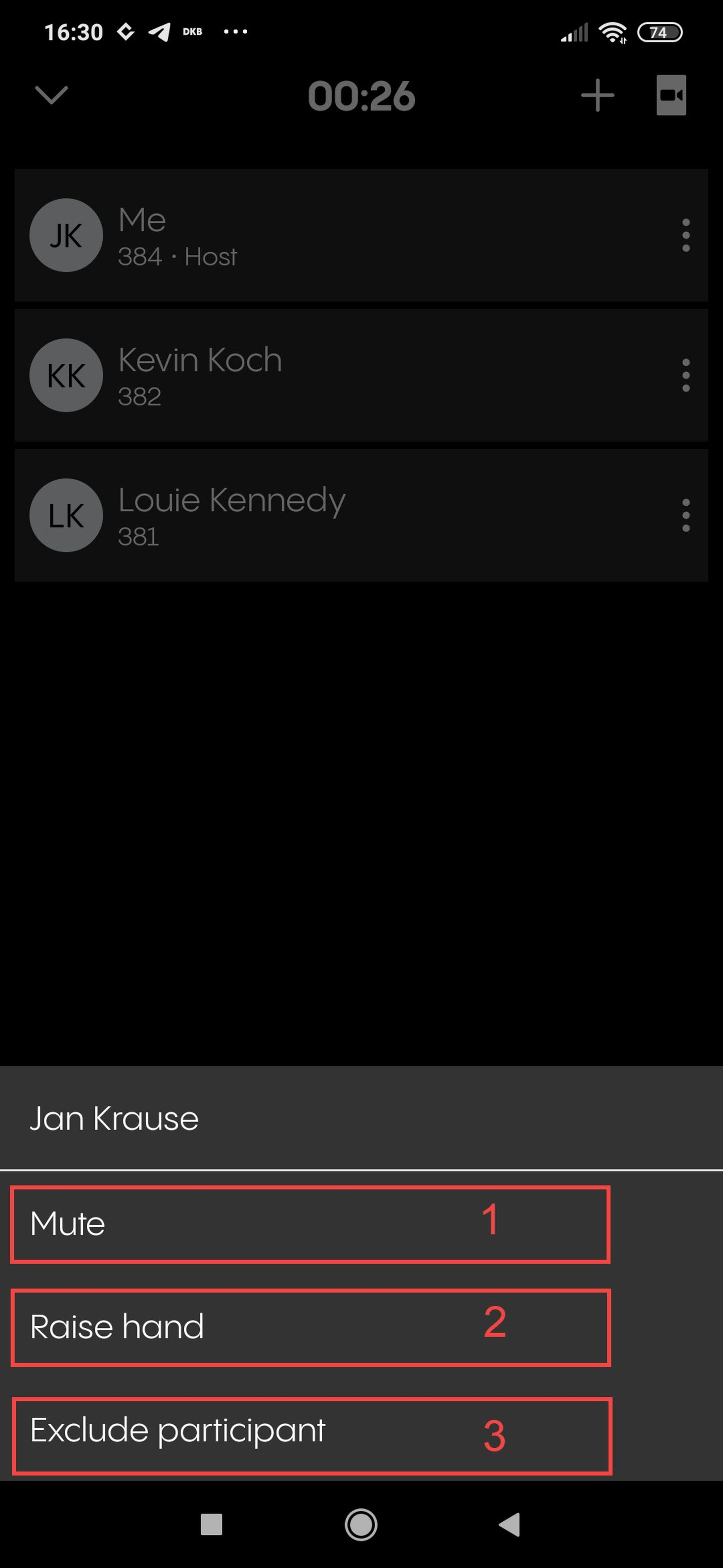 Tap on the arrow to access the extended call actions. In this menu, as host, you can:
