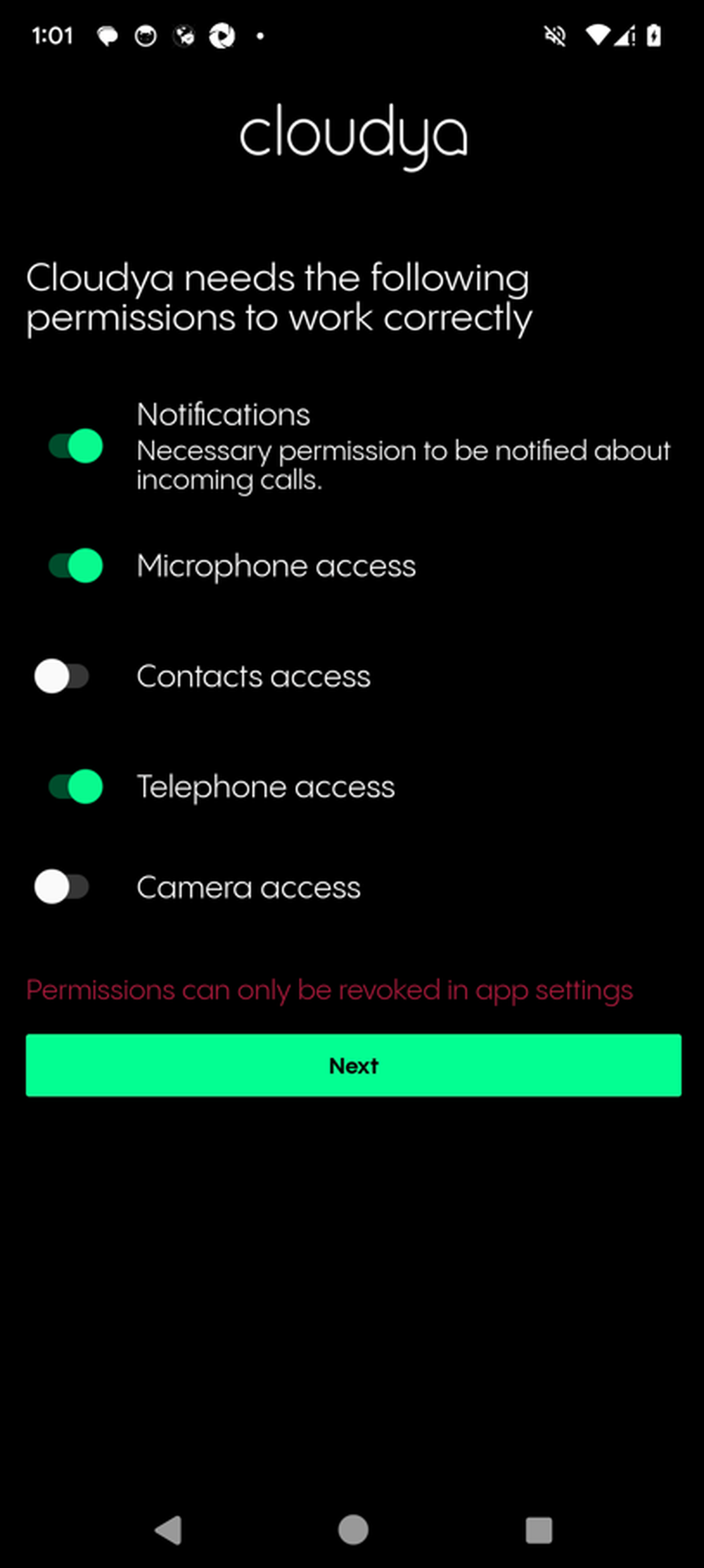 Whilst the other permissions are optional, please note that some features might not work as intended without the corresponding permissions (e.g. you can't make a video call without permitting access to your camera). Please note that you can only change the permissions granted in the Android app settings.
