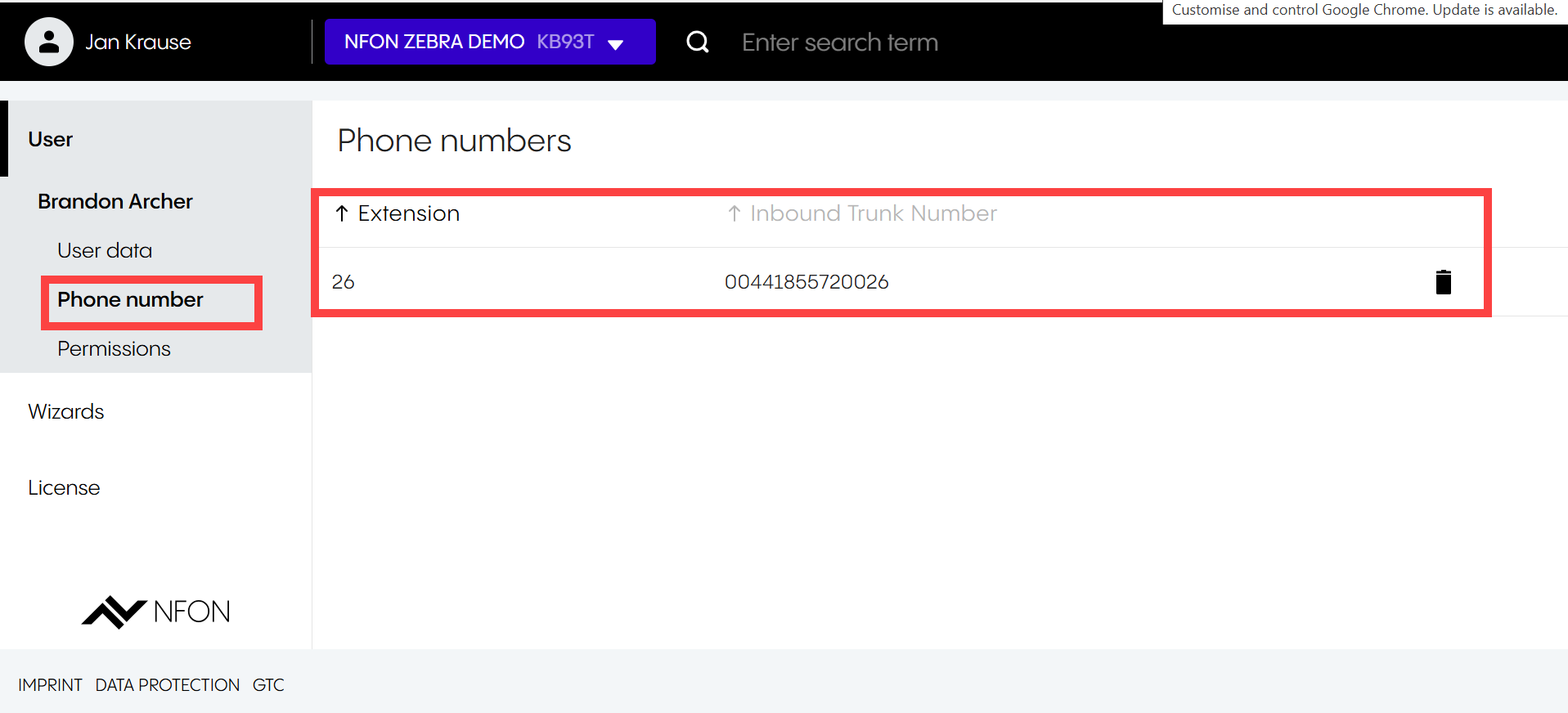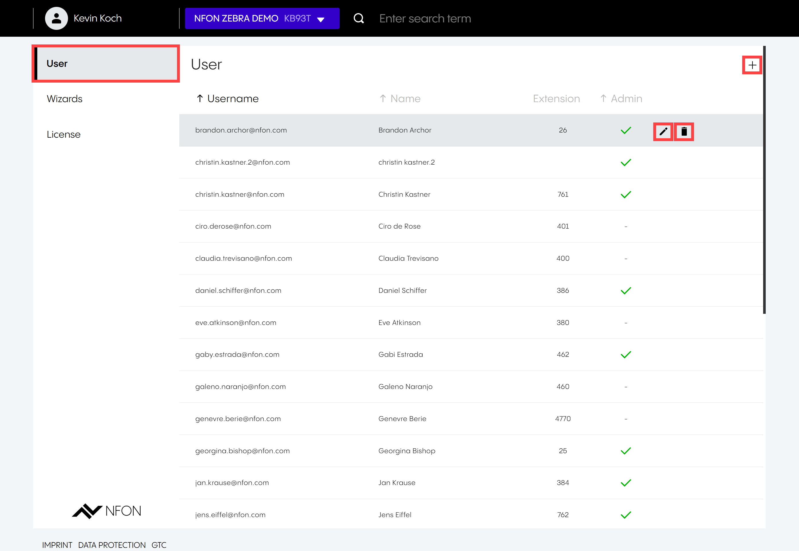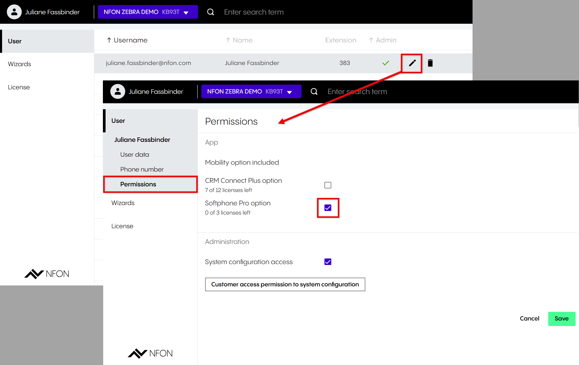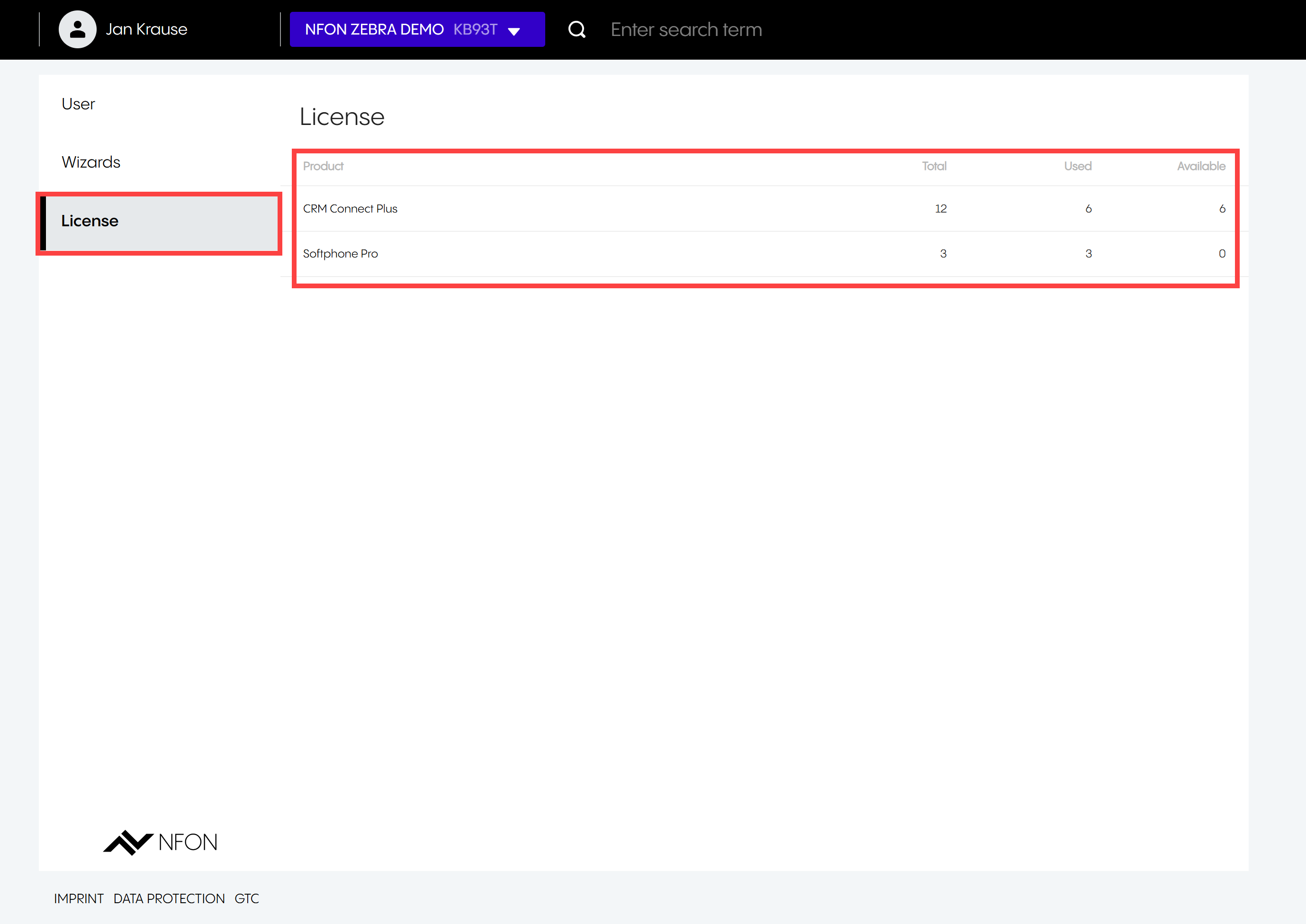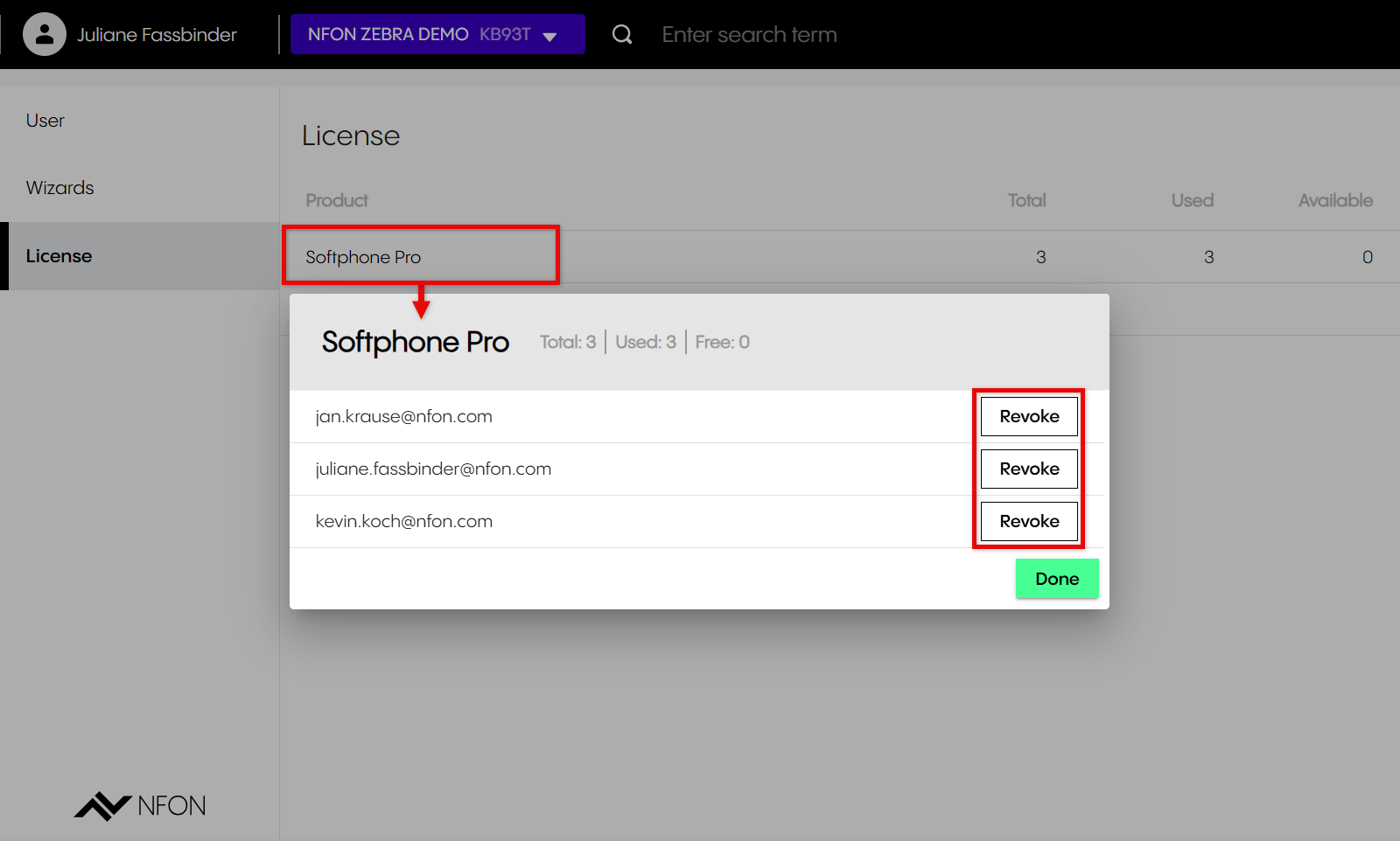 Click on a product (in the example here: Softphone Pro) to see which users have licenses.